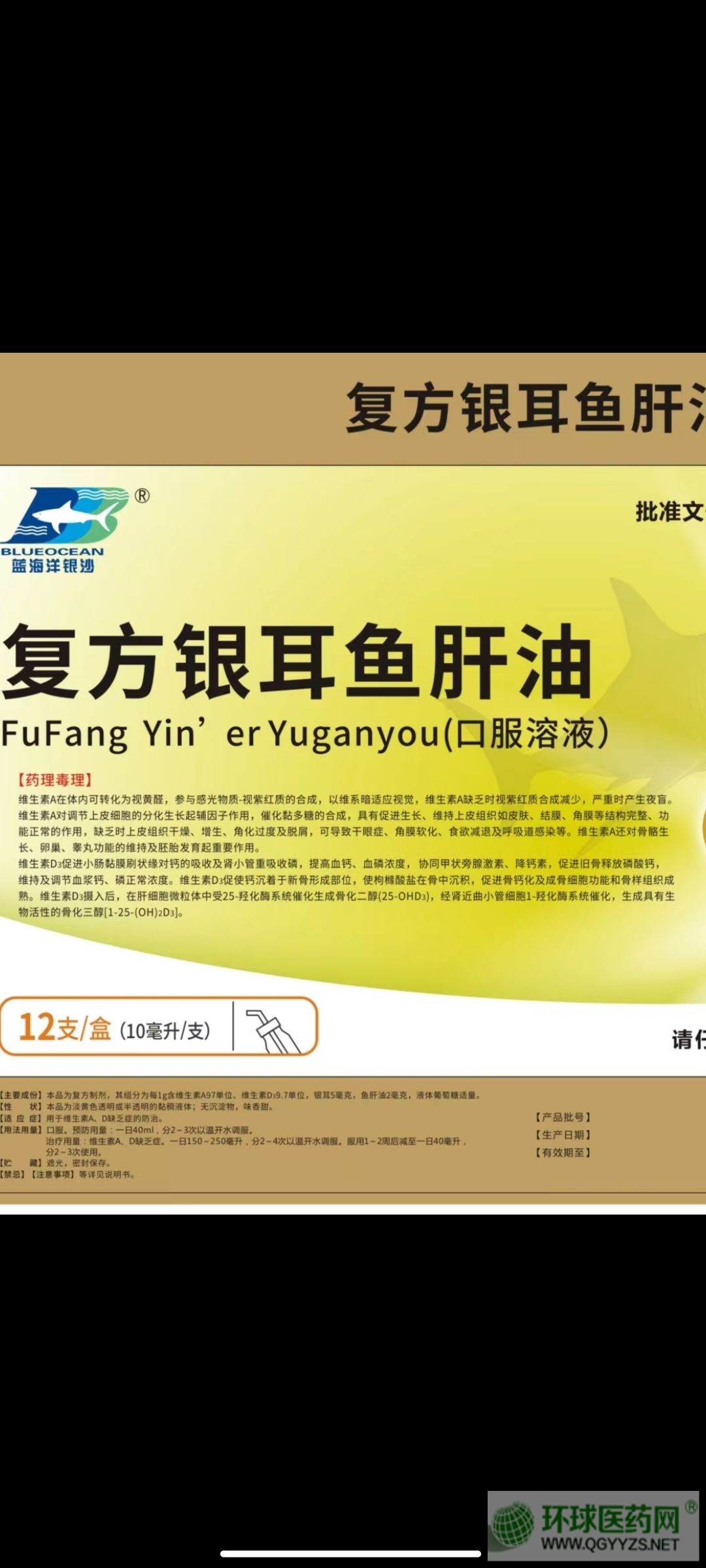 拼音名稱:Fufang Yin’er Yuganyou Ru - 【成份】本品為復(fù)方制劑,其組分為每克含維生素A300單位、維生素D3 30單位。