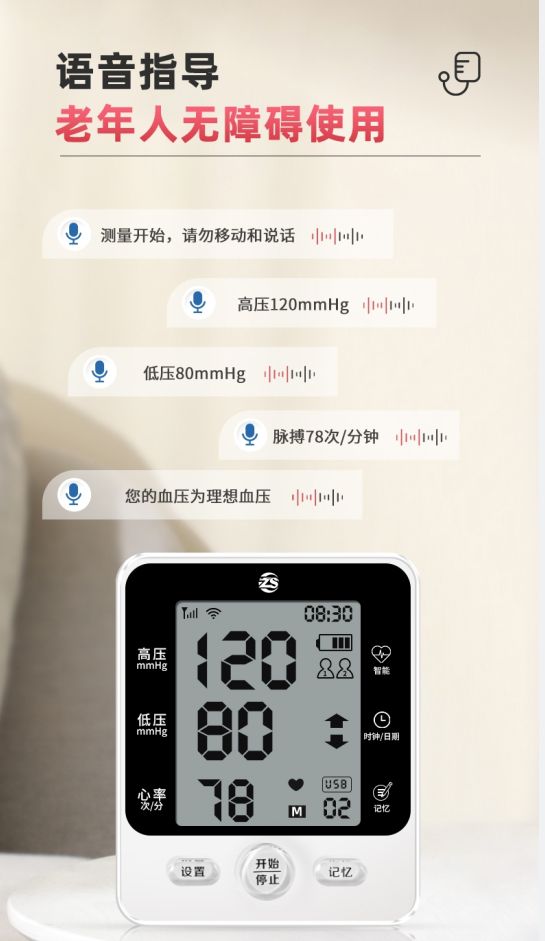 | 使用方法 | 直接測量,當(dāng)您綁好臂帶后,便可開始測量: 1)按下“開關(guān)”鍵,LCD下部“”出現(xiàn)閃動幾次,并發(fā)出語音提示“注意!請確定綁帶與心臟部位同高,不要移動和說話,現(xiàn)在開始測量”,語音播報完后馬達轉(zhuǎn)動加壓。 2)加壓時,壓力指示條相應(yīng)進行變化,當(dāng)壓力達到穩(wěn)定值后,馬達停止工作,LCD排氣圖標(biāo)出現(xiàn),袖帶中的壓力開始勻速放氣(如果壓力不足無法穩(wěn)定時,則機器會重新充氣)。 3)當(dāng)偵測到脈搏時,LCD出現(xiàn)♥圖標(biāo)并閃動。 4)當(dāng)測量完畢,袖帶放氣,收縮壓、舒張壓及脈搏將在LCD顯出來,并且系統(tǒng)將結(jié)果與血壓國際標(biāo)準(zhǔn)進行比對,對測量結(jié)果進行語音播報(語音設(shè)置關(guān)時將不播報)讓您了解自己的血壓是否正常。 5)在無任何操作狀態(tài)下,60秒后機器將自動關(guān)閉。 |
