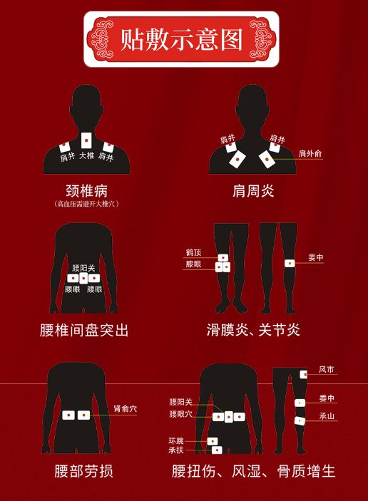 | 產(chǎn)品賣點(diǎn) | 腰扭傷、腰部勞損、肩周炎、風(fēng)濕、頸椎病,骨質(zhì)增生,滑膜炎,關(guān)節(jié)炎,腰椎間盤突出等人群使用Ⅲ型(頸肩腰痛貼)穴位貼、貼于對應(yīng)穴位處(詳見穴位圖)。 |