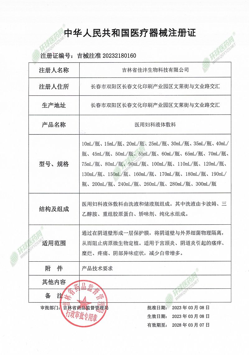 | 補(bǔ)充說(shuō)明 | 【產(chǎn)品名稱】 醫(yī)用婦科液體敷料 【型號(hào)規(guī)格】 200mL/瓶 【生產(chǎn)許可證編號(hào)】 吉藥監(jiān)械生產(chǎn)許20230105號(hào) 【醫(yī)療器械注冊(cè)證編號(hào)】吉械注準(zhǔn)20232180160 【產(chǎn)品技術(shù)要求編號(hào)】吉械注準(zhǔn)20232180160 【產(chǎn)品性能 】 1、外觀:儲(chǔ)液瓶表面應(yīng)清潔,無(wú)鋒棱、無(wú)缺料。 2、洗液顏色為無(wú)色或淺黃色、色澤均勻。 3、每100ml中含羧酸基(-COOH)為0.05g-0.15g。其他詳見(jiàn)產(chǎn)品技術(shù)要求。 【結(jié)構(gòu)及組成】 醫(yī)用婦科液體敷料由洗液和儲(chǔ)液瓶組成。其中洗液由卡波姆、三乙醇胺、重組膠原蛋白、矯味劑、純化水組成。 【適用范圍】 通過(guò)在陰道壁形成一層保護(hù)膜,將陰道壁與外界細(xì)菌物理隔離,從而阻止病原微生物定植。適用于宮頸炎、陰道炎引起的瘙癢、糜爛、疼痛、陰部異味癥狀,減少白帶增多。 【使用方法】 1、使用企業(yè)配帶的沖洗器,將液體注入陰道深部,早晚各沖洗一次。 2、日常護(hù)理和外陰清洗:取洗液10ml左右,按1:10比例加溫水稀釋后清洗外陰。 【禁 忌 癥】 對(duì)本品過(guò)敏者禁用。 【注 冊(cè) 人、生產(chǎn)企業(yè)、售后服務(wù)單位】 吉林省佳灃生物科技有限公司 【使用期限】 三年 |