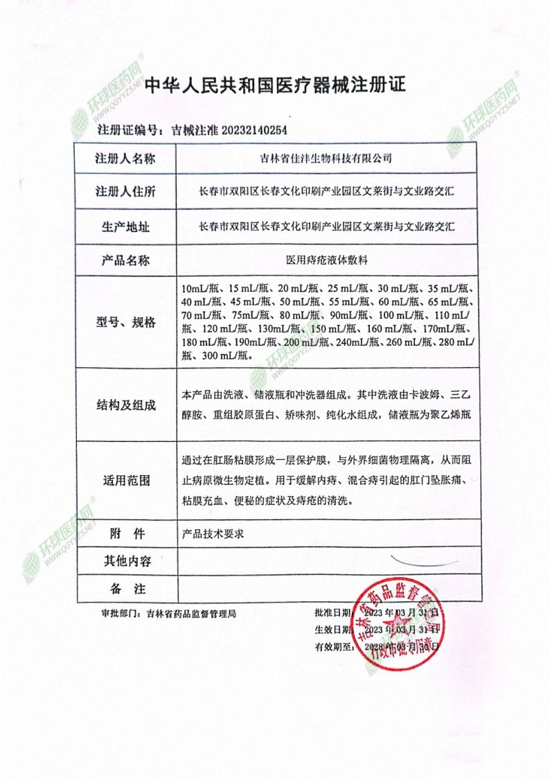 | 補(bǔ)充說明 | 【產(chǎn)品名稱】 醫(yī)用痔瘡液體敷料 【型號規(guī)格】 200mL/瓶 【生產(chǎn)許可證編號】 吉藥監(jiān)械生產(chǎn)許20230105號 【醫(yī)療器械注冊證編號】吉械注準(zhǔn)20232140254 【產(chǎn)品技術(shù)要求編號】吉械注準(zhǔn)20232140254 【產(chǎn) 品 性 能 】1、外觀:儲液瓶表面應(yīng)光滑,無鋒棱、無缺料; 2、洗液顏色為無色或淺黃色、色澤均勻。 3、每100g中含羧酸基(-COOH)為0.05g-0.15g。 其他詳見產(chǎn)品技術(shù)要求。 【結(jié)構(gòu)及組成】 醫(yī)用痔瘡液體敷料由洗液、儲液瓶和沖洗器組成。其中洗液由卡波姆、三乙醇胺、重組膠原蛋白、矯味劑、純化水組成,儲液瓶為聚乙烯瓶。 【適用范圍】 通過在肛腸粘膜形成一層保護(hù)膜,與外界細(xì)菌物理隔離,從而阻止病原微生物定植。用于緩解內(nèi)痔、混合痔引起的肛門墜脹痛、粘膜充血、便秘的癥狀及痔瘡的清洗。 【使用方法】 每天1次,每次50ml,內(nèi)痔7天一個(gè)療程,外痔混合痔10天一個(gè)療程。日常護(hù)理,手洗干凈,原液倒入手中搓洗肛周,每次10-30ml,每日1-2次;坐浴以1:10的比例倒入溫水中清洗;沖洗內(nèi)痔應(yīng)插入肛門內(nèi),用原液100ml在腸道內(nèi)保留5-10分鐘。 【禁 忌 癥】 對本品過敏者禁用。 【注 冊 人、生產(chǎn)企業(yè)、售后服務(wù)單位】 吉林省佳灃生物科技有限公司 【使用期限】 三年 |