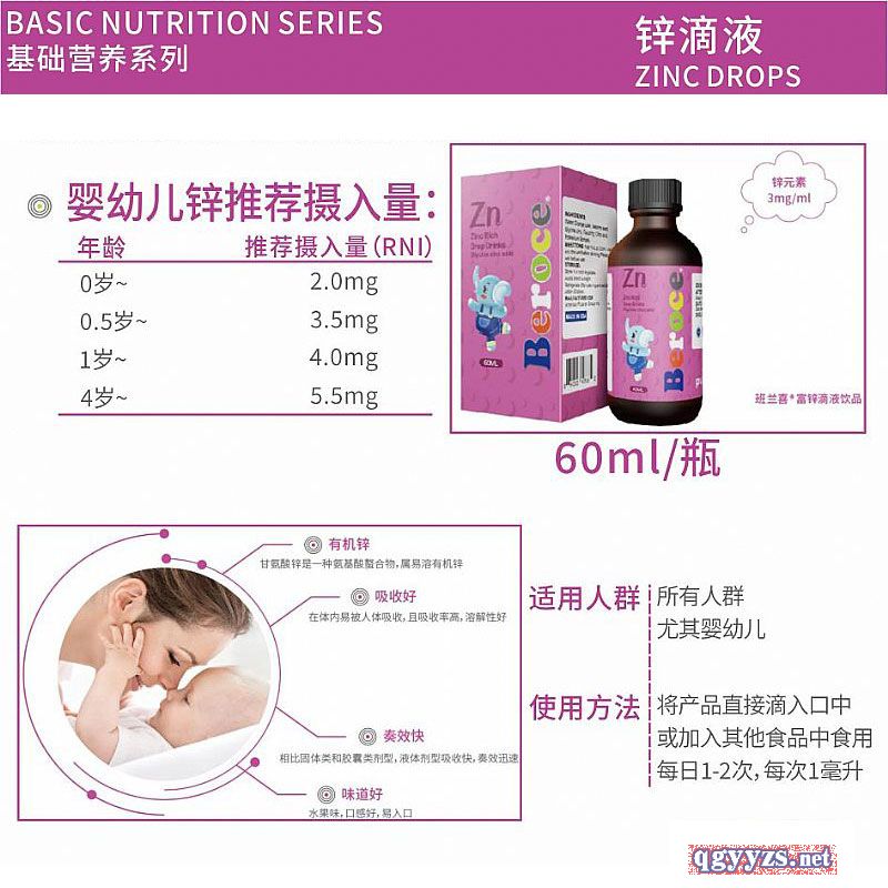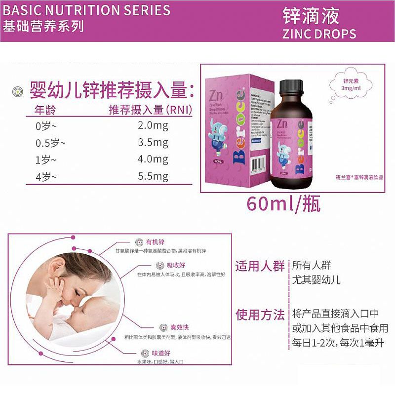 | 補(bǔ)充說明 | 配料:水、甘胺酸鋅、橙汁、芝麻、檸檬酸、酪蛋白磷酸肽。 含量:甘胺酸鋅6mg/ml 原產(chǎn)地:美國(guó)。 適用人群:**人群,尤其嬰幼兒 食用方法:飲用前搖勻,將1毫升加入適量水中稀釋后飲用,或?qū)a(chǎn)品直接滴入口中也可加入其他食品中食用。如有少許沉淀,均屬正常。 每日1-2次,每次1毫升。 |