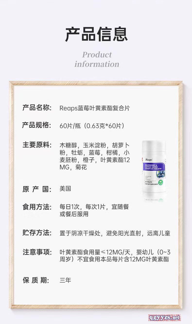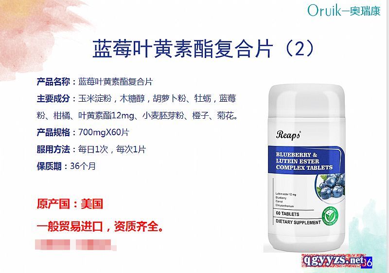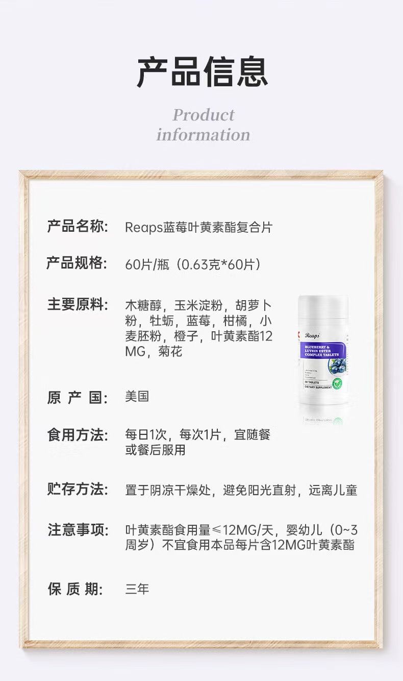 | 補(bǔ)充說(shuō)明 | 【產(chǎn)品名稱】:藍(lán)莓葉黃素酯復(fù)合片 【主要成分】:玉米淀粉,木糖醇,胡蘿卜粉、牡蠣,藍(lán)莓粉、柑橘、葉黃素酯12mg、小麥胚芽粉、橙子、菊花。 【產(chǎn)品規(guī)格】:700mgX60片 【服用方法】:每日1次,每次1片 【保質(zhì)期】:36個(gè)月 【原產(chǎn)國(guó)】:美國(guó) 一般貿(mào)易進(jìn)口,資質(zhì)齊全。 |