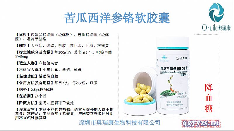 | 主要成分 | 苦瓜洋參軟膠囊是以西洋參提取物、苦瓜提取物、吡啶甲酸鉻、蜂蠟、大豆油、明膠、甘油、水、檸檬黃為主要原料制成的保健食品,‖型糖尿病及其并發(fā)癥有輔助保健作用。 每100g苦瓜洋參軟膠囊中含總皂苷4g,吡啶甲酸鉻70mg。 |