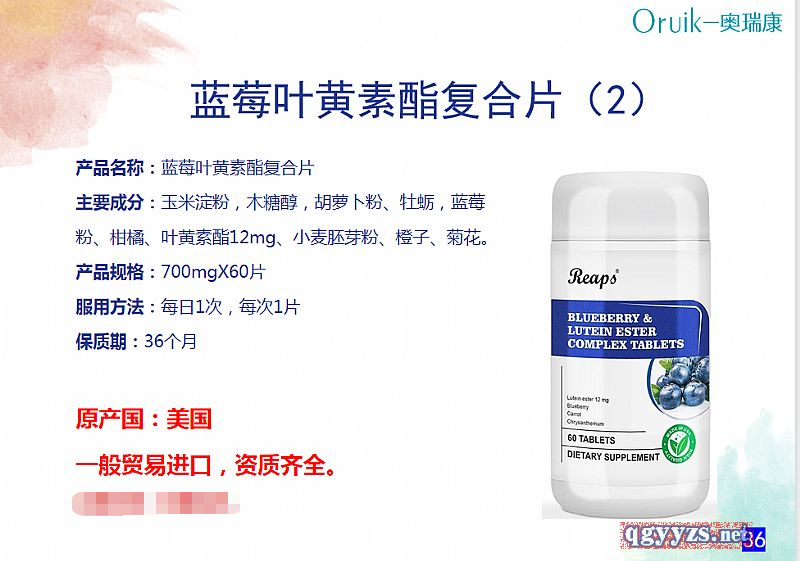 | 補(bǔ)充說明 | 產(chǎn)品名稱:美國原裝進(jìn)口藍(lán)莓葉黃素酯復(fù)合 熊-13045859985 【主要成分】玉米淀粉,木糖醇,胡蘿卜粉、牡蠣,藍(lán)莓粉、柑橘、葉黃素酯12mg、小麥胚芽粉、橙子、菊花 【產(chǎn)品規(guī)格】:700mgX60片 【服用方法】:每日1次,每次1片 【保質(zhì)期】:36個月 【原產(chǎn)國】:美國 一般貿(mào)易進(jìn)口,資質(zhì)齊全。 |
