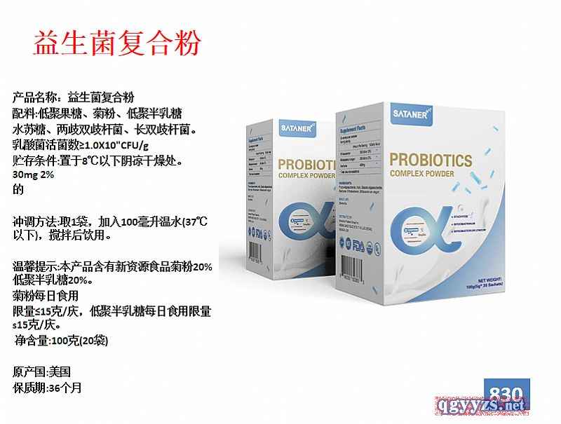 | 補(bǔ)充說(shuō)明 | 進(jìn)口益生菌復(fù)合粉 產(chǎn)品名稱(chēng):益生菌復(fù)合粉 配料:低聚果糖、菊粉、低聚半乳糖 水蘇糖、兩歧雙歧桿菌、長(zhǎng)雙歧桿菌。 乳酸菌活菌數(shù)≥1.0X10"CFU/g 原產(chǎn)國(guó):美國(guó) 保質(zhì)期:36個(gè)月 貯存條件:置于8℃以下陰涼干燥處。 30mg 2% 的 沖調(diào)方法:取1袋,加入100毫升溫水(37℃以下),攪拌后飲用。 溫馨提示:本產(chǎn)品含有新資源食品菊粉20%低聚半乳糖20%。 菊粉每日食用 限量≤15克/慶,低聚半乳糖每日食用限量s15克/慶。 凈含量:100克(20袋) 一天一袋,一盒可以服用20天。 美國(guó)原裝進(jìn)口益生菌粉,一天一袋,一盒可以服用20天。由美國(guó)原裝進(jìn)口,一般貿(mào)易,清關(guān)手續(xù)齊全。 |