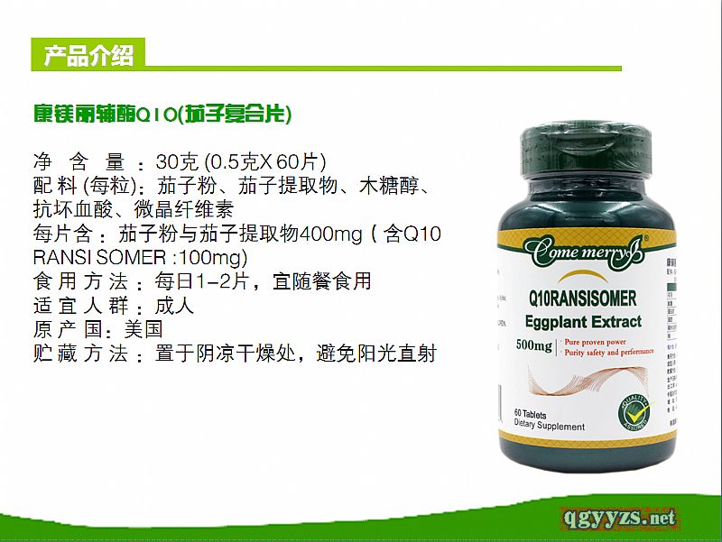 | 補(bǔ)充說(shuō)明 | 產(chǎn)品名:輔酶Q10 招商:13045859985 凈 含 量 :30克 (0.5克X 60片) 配 料 (每粒):茄子粉、茄子提取物、木糖醇、抗壞血酸、微晶纖維素 每片含 :茄子粉與茄子提取物400mg(含Q10 RANSI SOMER :100mg) 食 用 方 法 :每日1-2片,宜隨餐食用 適 宜 人 群 :成人 原 產(chǎn) 國(guó):美國(guó) 貯 藏 方 法 :置于陰涼 |