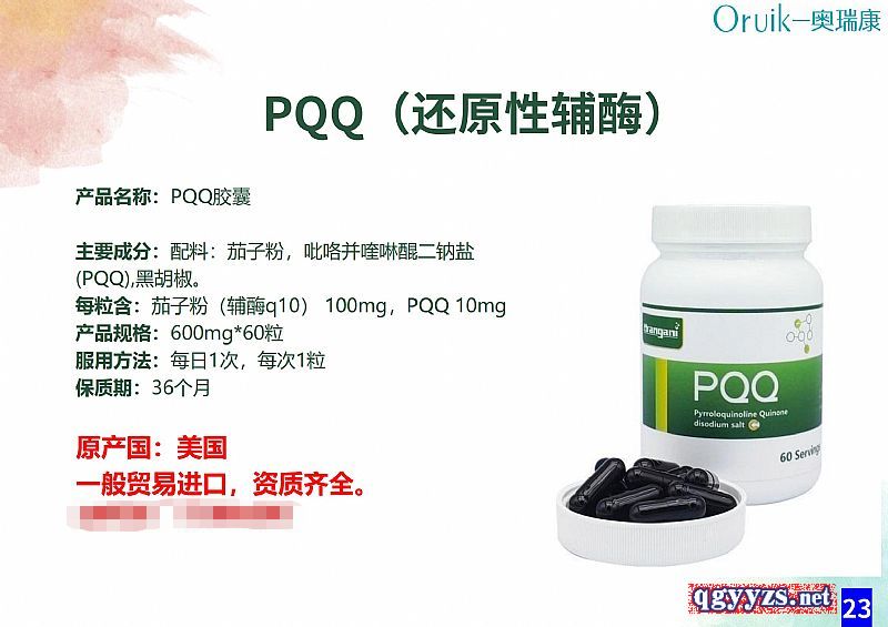 | 補(bǔ)充說明 | 產(chǎn)品名稱:PQQ膠囊 主要成分:配料:茄子粉,吡咯并喹啉醌二鈉鹽(PQQ),黑胡椒。 每粒含:茄子粉(輔酶q10) 100mg,PQQ 10mg 產(chǎn)品規(guī)格:600mg*60粒 服用方法:每日1次,每次1粒 保質(zhì)期:36個(gè)月 原產(chǎn)國:美國 一般貿(mào)易進(jìn)口,資質(zhì)齊全。 |