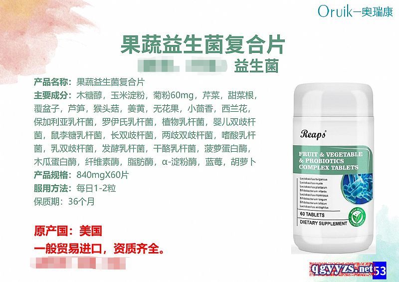 | 補(bǔ)充說明 | 招商:熊女士-13045859985 產(chǎn)品名稱:果蔬益生菌復(fù)合片 主要成分:木糖醇,玉米淀粉,菊粉60mg,芹菜,甜菜根,覆盆子,蘆筍,猴頭菇,姜黃,無花果,小茴香,西蘭花,保加利亞乳桿菌,羅伊氏乳桿菌,植物乳桿菌,嬰兒雙歧桿菌,鼠李糖乳桿菌,長雙歧桿菌,兩歧雙歧桿菌,嗜酸乳桿菌,乳雙歧桿菌,發(fā)酵乳桿菌,干酪乳桿菌,菠蘿蛋白酶,木瓜蛋白酶,纖維素酶,脂肪酶,α-淀粉酶,藍(lán)莓,胡蘿卜 產(chǎn)品規(guī)格:840mgX60片 服用方法:每日1-2粒 保質(zhì)期:36個(gè)月 |