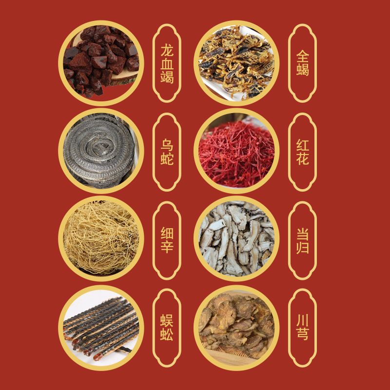 | 主要成分 | 本品是以龍血竭、烏蛇、細(xì)辛、蜈蚣、全蝎、紅花、當(dāng)歸、川芎為主要原料,經(jīng)特定工藝加工而成。 |