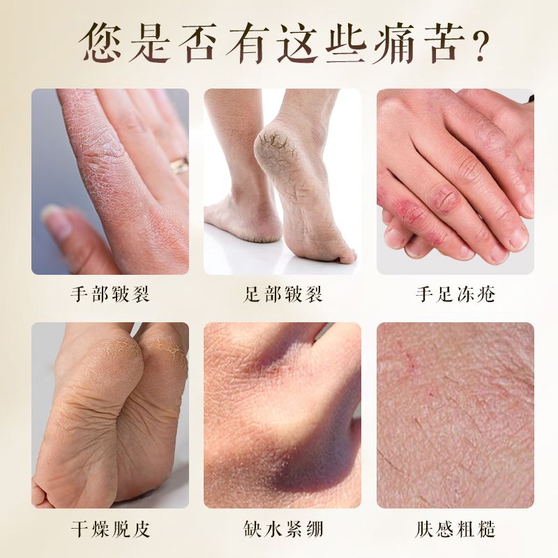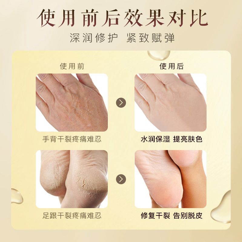 | 使用方法 | 手部:洗凈手部擦干水分,取適量產(chǎn)品均勻涂抹于手部,輕輕按摩促進(jìn)吸收即可。腳部:先熱水泡腳10-15分鐘,軟化角質(zhì)層,擦干后取適量膏體涂抹在裂口處,按摩3分鐘,靜等10分鐘膏體形成保護(hù)膜即可。 |