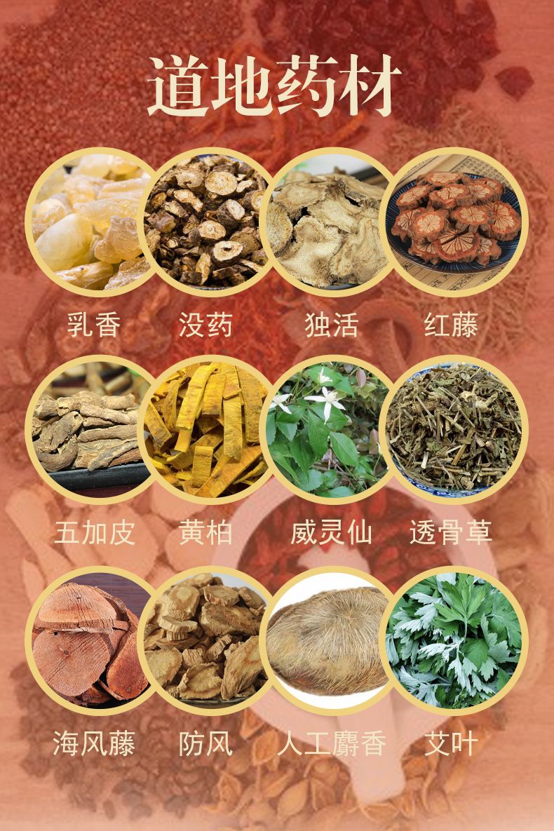| 主要成分 | 本品是以乳香、沒藥、獨(dú)活、紅藤、五加皮、黃柏、威靈仙、透骨草、海風(fēng)藤、防風(fēng)、人工麝香、艾葉等為主要原料,經(jīng)特定工藝加工而成。 |