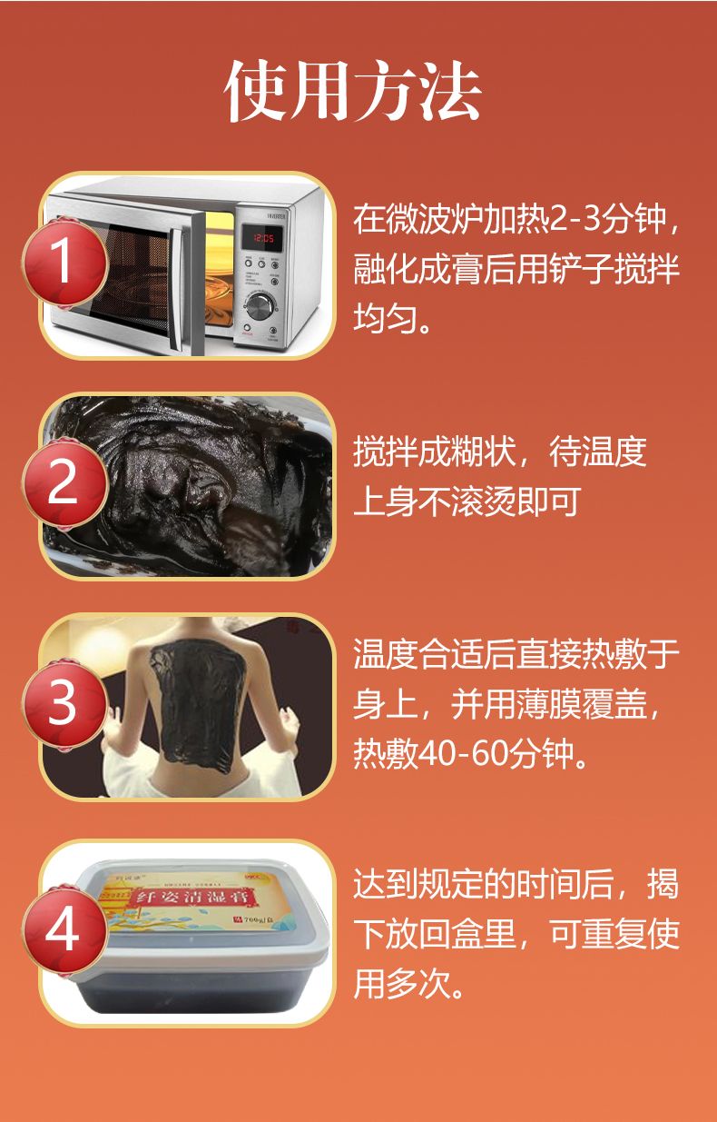 | 用法用量 | 在微波爐中加熱2-3分鐘,融化成膏后用鏟子攪拌均勻,溫度合適后直接熱敷于身上,并用薄膜覆蓋,熱敷40至60分鐘后揭下放回盒里,可重復(fù)使用。 |