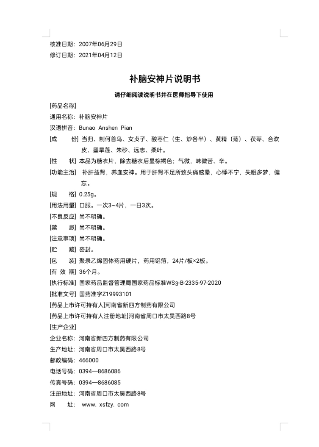 | 通用名稱 | 補(bǔ)腦安神片 |