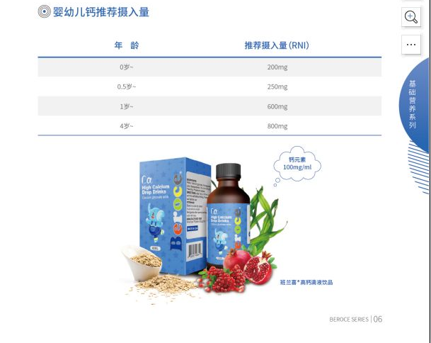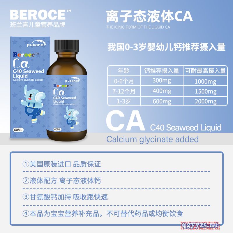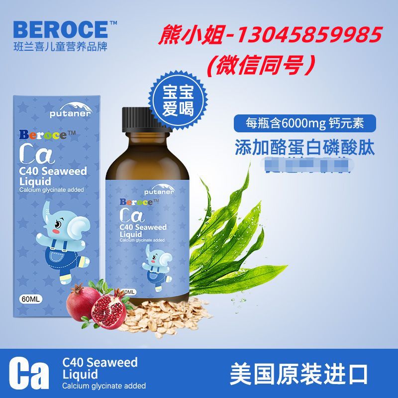 | 主要成分 | 配料:水,甘氨酸鈣,石榴汁,海藻(海帶),燕麥,黃原膠,酪蛋白磷酸肽。 含量:甘氨酸鈣100mg/ml |