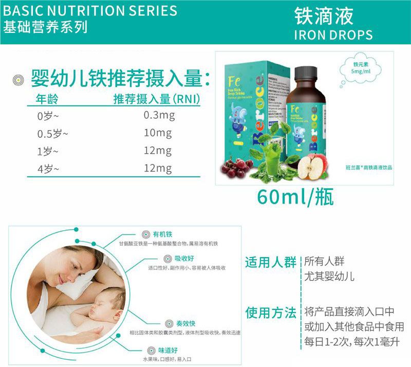 | 補充說明 | 招商:熊-13045859985 鐵滴液 配料:水、甘胺酸亞鐵、菠菜汁、蘋果汁、櫻桃汁、甘油、黃原膠、酪蛋白磷酸肽 含量:甘胺酸亞鐵12mg/ml 原產(chǎn)地:美國 適用人群:**人群,尤其嬰幼兒 規(guī)格:60ml/瓶 貯藏條件;放置于陰涼干燥處,避免陽光直射。開封后請冷藏。 使用方法:飲用前請搖勻,將1毫升加入適量的水中稀釋后飲用或?qū)a(chǎn)品直接滴入口中,也可以加入其他食品中食用。如有少許沉淀,均屬正常。 每日1-2次,每次1毫升 |