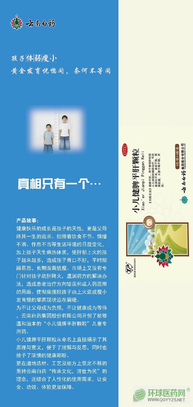 | 補(bǔ)充說(shuō)明 | 云南白藥小兒健脾平肝顆粒項(xiàng)目載體——產(chǎn)品說(shuō)明 研究現(xiàn)狀: 兒童疏肝降火迫于成人藥混用和治療方向錯(cuò)誤(就像六味地黃丸和知柏地黃丸的治療方向不同)。 需求潛力: 由于高熱量食物攝入,熬夜,情緒壓力、肝旺體質(zhì)等導(dǎo)致肝火旺的孩子越來(lái)越多。疏肝祛火極具市場(chǎng)潛力。 核心賣點(diǎn): 針對(duì)兒童疏肝降火的獨(dú)家中成藥,并開創(chuàng)新療效。 解決痛點(diǎn): 從根本上解決孩子瘦小發(fā)育慢,煩躁愛發(fā)火,注意力不集中,睡眠不踏實(shí)。 肝旺表現(xiàn): 手腳心較熱,大便干稀不調(diào),眼干眼澀眼屎多,口臭,小便又黃又少,來(lái)回翻身趴著睡,夜啼夜夢(mèng),舌頭苔黃質(zhì)紅,鼻梁青筋等。 |