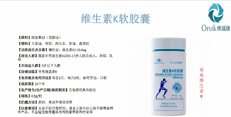 | 補(bǔ)充說明 | 【原料】維生素K2(發(fā)酵法) 【輔料】大豆油,明膠,純化水,甘油,甜菜紅 【功效成分及含量】每粒含:維生素K2 25.0ug 【適宜人群】 需要補(bǔ)充維生素K2的4-17歲人群及成人、孕婦、乳母 【不適宜人群】3歲以下人群 【保健功能】補(bǔ)充維生素K 【食用量及食用方法】每日1次,每次1粒, 食用方法:口服 【保質(zhì)期】24個月 【生產(chǎn)批號/生產(chǎn)日期/保質(zhì)期至】見包裝物具體部位 【規(guī)格】0.5g/粒 【貯藏方法】密封,常溫干燥處保存 【注意事項(xiàng)】本品不能代替藥物。適宜人群外的人群不推薦食用本產(chǎn)品。不宜超過推薦量或與同類營養(yǎng)素同時食用。 |