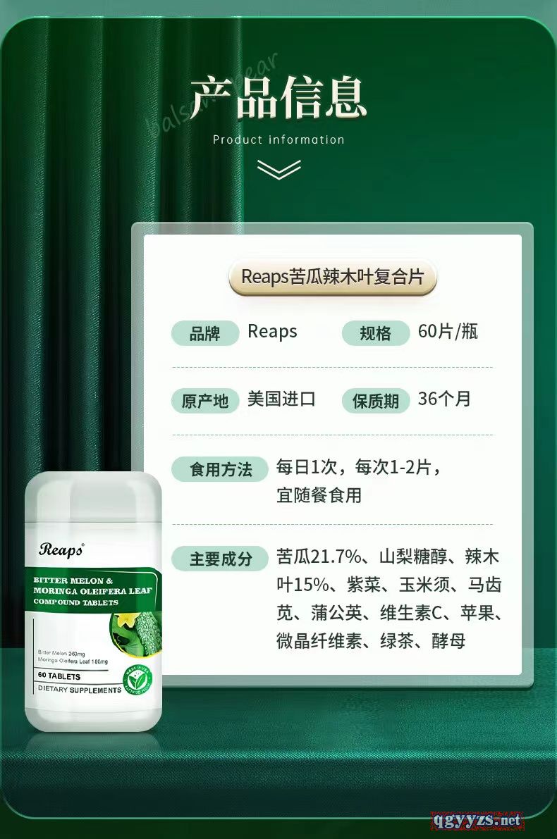 | 主要成分 | 苦瓜(30%苦瓜素)260mg、辣木葉180mg、玉米須100mg、馬齒莧75mg、蒲公英60mg、綠茶30mg、維生素C50mg、酵母(鉻0.02mg)3mg、蘋果(鋅20mg)36mg、紫菜(鎂80mg)120mg、山梨糖醇、微晶纖維素。 |