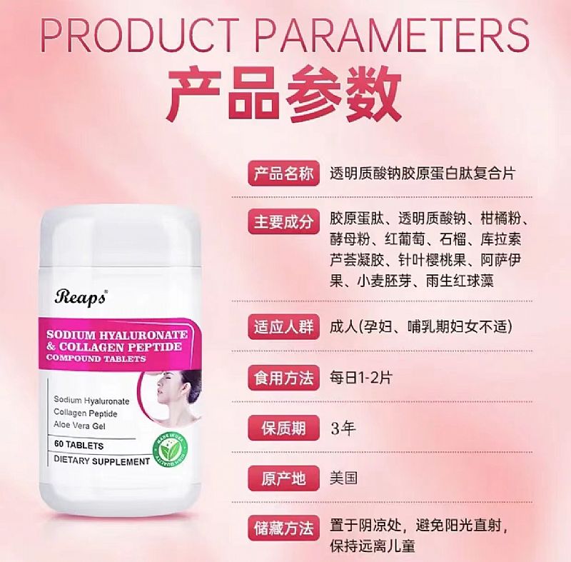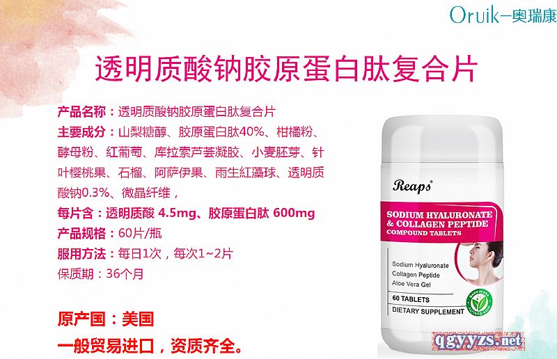 | 補充說明 | 產(chǎn)品名稱:透明質(zhì)酸鈉膠原蛋白肽復(fù)合片 主要成分:山梨糖醇、膠原蛋白肽40%、柑橘粉、酵母粉、紅葡萄、庫拉索蘆薈凝膠、小麥胚芽、針葉櫻桃果、石榴、阿薩伊果、雨生紅藻球、透明質(zhì)酸鈉0.3%、微晶纖維, 每片含:透明質(zhì)酸 4.5mg、膠原蛋白肽 600mg 產(chǎn)品規(guī)格:60片/瓶 服用方法:每日1次,每次1~2片 保質(zhì)期:36個月 原產(chǎn)國:美國 一般貿(mào)易進口,資質(zhì)齊全。 |