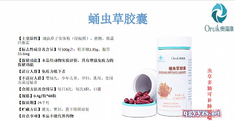 | 補充說明 | 【主要原料】 蛹蟲草子實體粉(經(jīng)輻照)、蔗糖、微晶纖維素 【標志性成分及含量】每100g含:粗多糖2.95g、腺苷33.6mg 【保健功能】本品經(jīng)動物實驗評價,具有增強免疫力的保健功能 【適宜人群】免疫力低下者 【不適宜人群】嬰幼兒、少年兒童、孕婦、乳母、食用真菌過敏者 【食用方法及食用量】每日3次,每次3粒,口服 【規(guī)格】0.4g/粒*60粒 【保質期】24個月 【貯藏方法】避光、密封,置干燥陰涼處 【注意事項】本品不能代替藥物 |