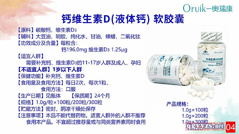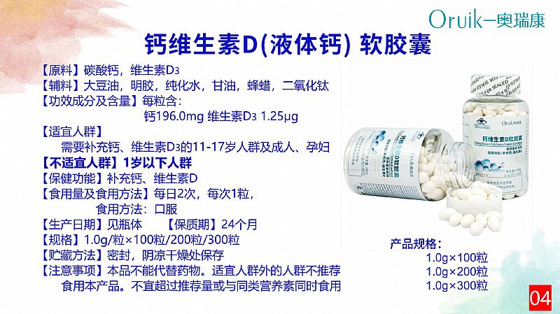 | 補充說明 | 【原料】碳酸鈣,維生素D3 【輔料】大豆油,明膠,純化水,甘油,蜂蠟,二氧化鈦 【功效成分及含量】每粒含:鈣196.0mg 維生素D3 1.25μg 【適宜人群】需要補充鈣、維生素D3的11-17歲人群及成人、孕婦 【不適宜人群】1歲以下人群 【保健功能】補充鈣、維生素D 【食用量及食用方法】每日2次,每次1粒,食用方法:口服 【生產日期】見瓶體 【保質期】24個月 【規(guī)格】1.0g/粒 【貯藏方法】密封,陰涼干燥處保存 【注意事項】本品不能代替藥物。適宜人群外的人群不推薦食用本產品。不宜超過推薦量或與同類營養(yǎng)素同時食用 |