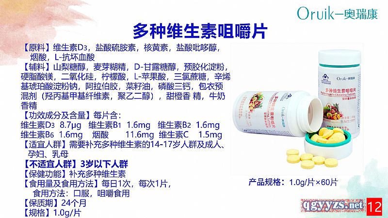 | 作用機理 | 【功效成分及含量】每片含:維生素D38.7μg維生素B11.6mg維生素B21.6mg維生素B61.6mg煙酸11.6mg維生素C161.5mg |