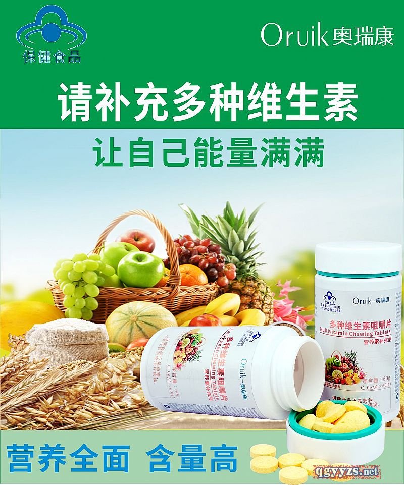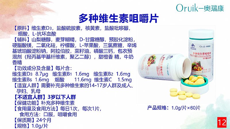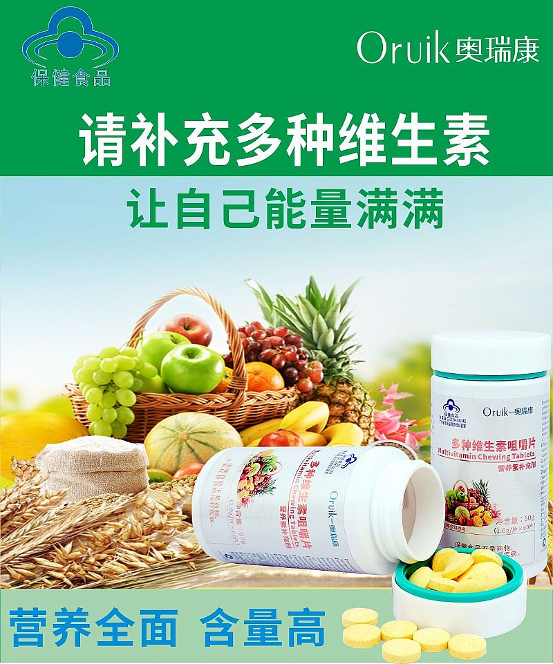 | 補充說明 | 【原料】維生素D3,鹽酸硫胺素,核黃素,鹽酸吡哆醇,煙酸,L-抗壞血酸 【輔料】山梨糖醇,麥芽糊精,D-甘露糖醇,預膠化淀粉,硬脂酸鎂,二氧化硅,檸檬酸,L-蘋果酸,三氯蔗糖,辛烯基琥珀酸淀粉鈉,阿拉伯膠,菜籽油,磷酸三鈣,包衣預混劑(羥丙基甲基纖維素,聚乙二醇),甜橙香精,牛奶香精 【功效成分及含量】每片含:維生素D3 8.7μg 維生素B1 1.6mg 維生素B2 1.6mg 維生素B6 1.6mg 煙酸 11.6mg 維生素C 161.5mg 【適宜人群】需要補充多種維生素的14-17歲人群及成人、孕婦、乳母 【不適宜人群】3歲以下人群 【保健功能】補充多種維生素 【食用量及食用方法】每日1次,每次1片,食用方法:口服,咀嚼食用 【保質期】24個月 【生產批號/生產日期/保質期至】見噴碼 【規(guī)格】1.0g/片 【貯藏方法】密封,常溫干燥處保存 【注意事項】本品不能代替藥物。適宜人群外的人群不推薦食用本產品。不宜超過推薦量或與同類營養(yǎng)素同時食用 |