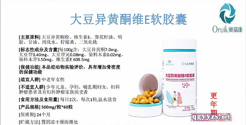 | 補充說明 | [主要原料] 大豆異黃酮粉、維生素E、葵花籽油、明膠、甘油、純化水、檸檬黃、二氧化鈦 [標(biāo)志性成分及含量]每100g含:大豆異黃酮7.0mg、大豆苷3.40mg、大豆苷元0.08mg、染料木素0.02mg、染料木苷3.50mg、維生素E 608.5mg [保健功能] 本品經(jīng)動物實驗評價,具有增加骨密度的保健功能 [適宜人群] 中老年女性 [不適宜人群] 少年兒童、孕婦、哺乳期婦女、婦科腫瘤患者及有婦科腫瘤家族病史者 [食用方法及食用量] 每日2次,每次1粒,溫水送食 [產(chǎn)品規(guī)格] 500mg/!60粒 [保質(zhì)期] 24個月 [貯藏方法] 置陰涼干燥防潮處 |