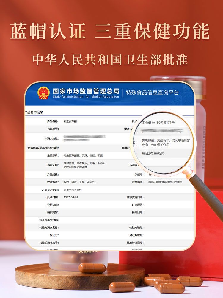 | 補充說明 | 補王蟲草精是以冬蟲夏草菌絲配以靈芝、香菇、莜麥制成,經(jīng)功能試驗證明,本品可增強單核巨噬細胞吞噬能力,提高機體細胞免疫和體液免疫。增強機體抵抗力。經(jīng)動物試驗證明,本品還具有抑制腫瘤的保健作用。并對化學性肝損傷有一定的保護作用。 |