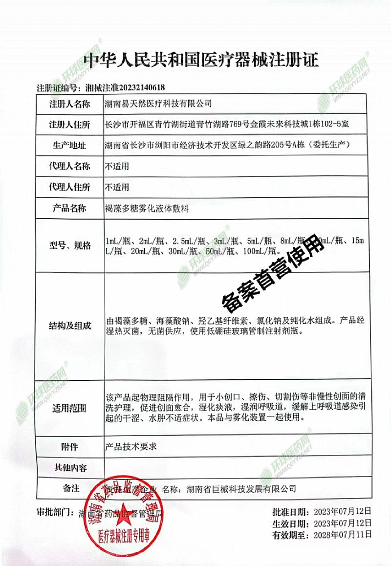 | 產(chǎn)品名稱 | 美舒坦-褐藻多糖霧化液體敷料 |