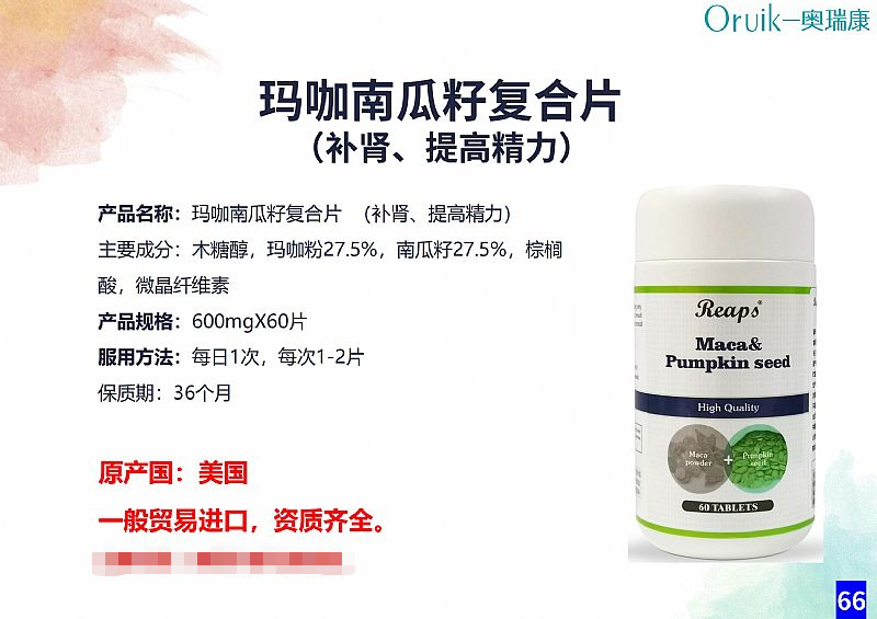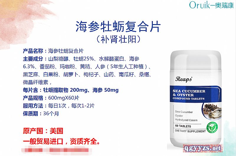 | 補(bǔ)充說(shuō)明 | 產(chǎn)品名稱:海參牡蠣復(fù)合片 主要成分:山梨糖醇、牡蠣25%、水解酪蛋白、海參6.3%、番茄粉、瑪咖粉、黃精、人參(5年生人工種植)、黑芝麻、白果粉、胡蘿卜、枸杞子、山藥、南瓜籽、桑椹、微晶纖維素, 每片含:牡蠣提取物 200mg、海參 50mg 產(chǎn)品規(guī)格:600mgX60片 服用方法:每日1次,每次1-2片 保質(zhì)期:36個(gè)月 原產(chǎn)國(guó):美國(guó) 一般貿(mào)易進(jìn)口,資質(zhì)齊全。 |