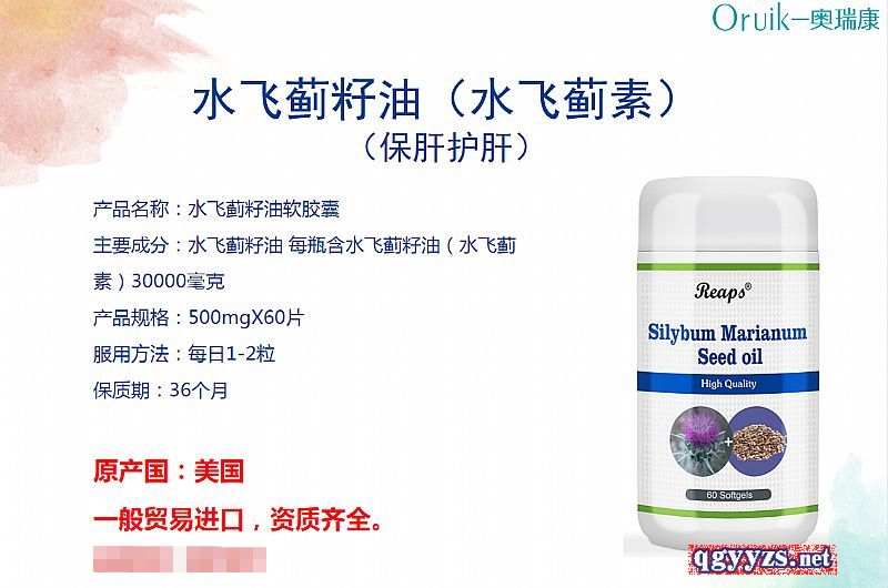| 補充說明 | 產(chǎn)品名稱:水飛薊籽油軟膠囊 主要成分:水飛薊籽油 每瓶含水飛薊籽油(水飛薊素)30000毫克 產(chǎn)品規(guī)格:500mgX60粒 服用方法:每日1-2粒 保質(zhì)期:36個月 原產(chǎn)國:美國 一般貿(mào)易進口,資質(zhì)齊全。 水飛薊籽油可以恢復(fù)肝的功能 |