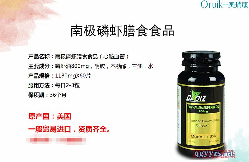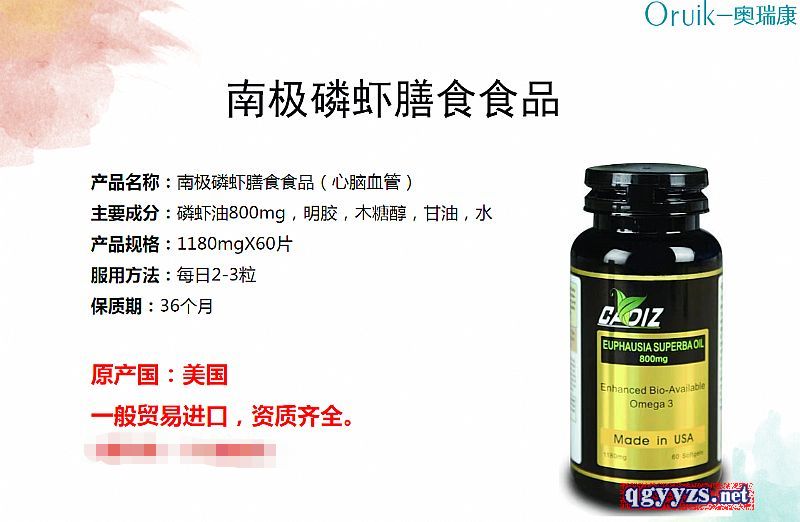 | 補充說明 | 產品名稱:南極磷蝦膳食食品(心腦血管) 主要成分:磷蝦油800mg,明膠,木糖醇,甘油,水 產品規(guī)格:1180mgX60片 服用方法:每日2-3粒 保質期:36個月 原產國:美國 一般貿易進口,資質齊全。 |