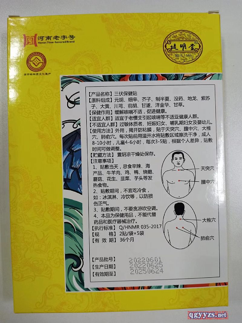 | 補(bǔ)充說明 | 不適宜人群:過敏體質(zhì)者,妊娠婦女,哺乳期婦女及嬰幼兒。 儲(chǔ)藏方法:置陰涼干燥處保存 注意事項(xiàng): 1、貼敷當(dāng)天忌食辛辣,海產(chǎn)品,牛羊肉,雞鴨花生、韭菜、等發(fā)物 2、貼敷期間不宜吃冷食 3、不要貪涼吹空調(diào) 4、本品為保健用品 ,不能代替藥品和醫(yī)療器械治療 |
