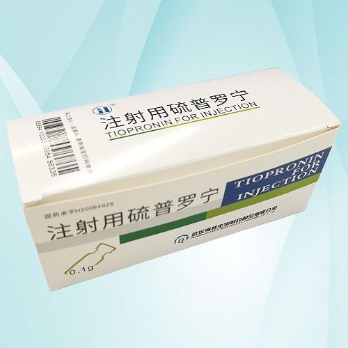 | 用法用量 | 靜脈滴注,每日0.2g,連續(xù)4周。 臨用前每支注射用硫普羅寧(100mg/支)先用2ml5%的碳酸氫鈉(pH=8.5)溶液溶解。再擴容至250~500ml5%~10%的葡萄糖溶液或生理鹽水中,常規(guī)靜脈滴注。 |