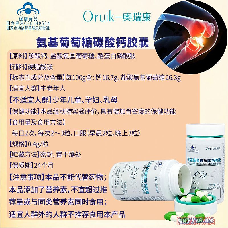 | 補充說明 | 【原料】 碳酸鈣、鹽酸氨基葡萄糖、酪蛋白磷酸肽 【輔料】硬脂酸鎂 【標志性成分及含量】每100g含:鈣 16.7g、鹽酸氨基葡萄糖 26.3g 【適宜人群】中老年人 【不適宜人群】少年兒童、孕婦、乳母 【保健功能】本品經(jīng)動物實驗評價,具有增加骨密度的保健功能 【食用量及食用方法】每日2次,每次2~3粒,口服(早晨2粒,晚上3粒) 【規(guī)格】0.4g/粒 【貯藏方法】密封,置干燥處 【保質(zhì)期】24個月 【注意事項】本品不能代替藥物;本品添加了營養(yǎng)素,不宜超過推薦量或與同類營養(yǎng)素同時食用;適宜人群外的人群不推薦食用本產(chǎn)品 |