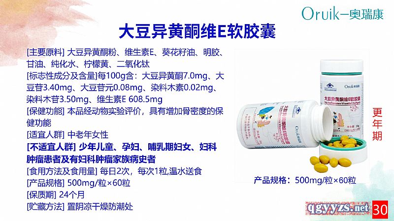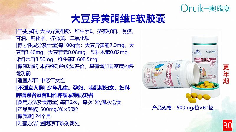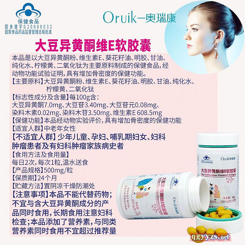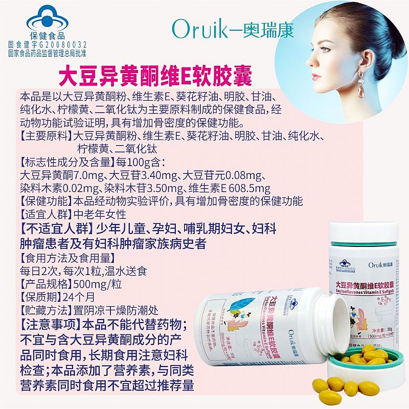 | 補充說明 | 本品是以大豆異黃酮粉、維生素E、葵花籽油、明膠、甘油、純化水、檸檬黃、二氧化鈦為主要原料制成的保健食品,經動物功能試驗證明,具有增加骨密度的保健功能。 【主要原料】大豆異黃酮粉、維生素E、葵花籽油、明膠、甘油、純化水、檸檬黃、二氧化鈦 【標志性成分及含量】每100g含:大豆異黃酮7.0mg、大豆苷3.40mg、大豆苷元0.08mg、染料木素0.02mg、染料木苷3.50mg、維生素E 608.5mg 【保健功能】本品經動物實驗評價,具有增加骨密度的保健功能 【適宜人群】中老年女性 【不適宜人群】 少年兒童、孕婦、哺乳期婦女、婦科腫瘤患者及有婦科腫瘤家族病史者 【食用方法及食用量】 每日2次,每次1粒,溫水送食 【產品規(guī)格】500mg/粒 【保質期】24個月 【貯藏方法】置陰涼干燥防潮處 【注意事項】本品不能代替藥物;不宜與含大豆異黃酮成分的產品同時食用,長期食用注意婦科檢查;本品添加了營養(yǎng)素,與同類營養(yǎng)素同時食用不宜超過推薦量 |