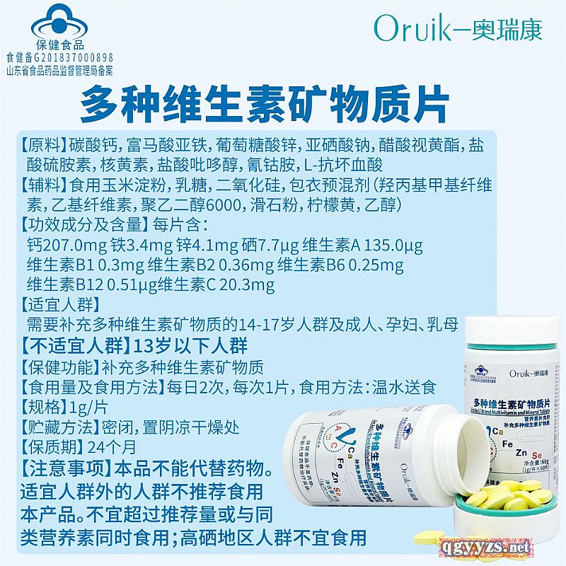 | 補(bǔ)充說(shuō)明 | 【原料】碳酸鈣,富馬酸亞鐵,葡萄糖酸鋅,亞硒酸鈉,醋酸視黃酯,鹽酸硫胺素,核黃素,鹽酸吡哆醇,氰鈷胺,L-抗壞血酸 【輔料】食用玉米淀粉,乳糖,二氧化硅,包衣預(yù)混劑(羥丙基甲基纖維素,乙基纖維素,聚乙二醇6000,滑石粉,檸檬黃,乙醇) 【功效成分及含量】 每片含:鈣207.0mg 鐵3.4mg 鋅4.1mg 硒7.7μg 維生素A 135.0μg 維生素B1 0.3mg 維生素B2 0.36mg 維生素B6 0.25mg 維生素B12 0.51μg維生素C 20.3mg 【適宜人群】需要補(bǔ)充多種維生素礦物質(zhì)的14-17歲人群及成人、孕婦、乳母 【不適宜人群】13歲以下人群 【保健功能】補(bǔ)充多種維生素礦物質(zhì) 【食用量及食用方法】每日2次,每次1片,食用方法:溫水送食 【規(guī)格】1g/片 【貯藏方法】密閉,置陰涼干燥處 【保質(zhì)期】 24個(gè)月 【注意事項(xiàng)】本品不能代替藥物。適宜人群外的人群不推薦食用本產(chǎn)品。不宜超過(guò)推薦量或與同類營(yíng)養(yǎng)素同時(shí)食用;高硒地區(qū)人群不宜食用 |