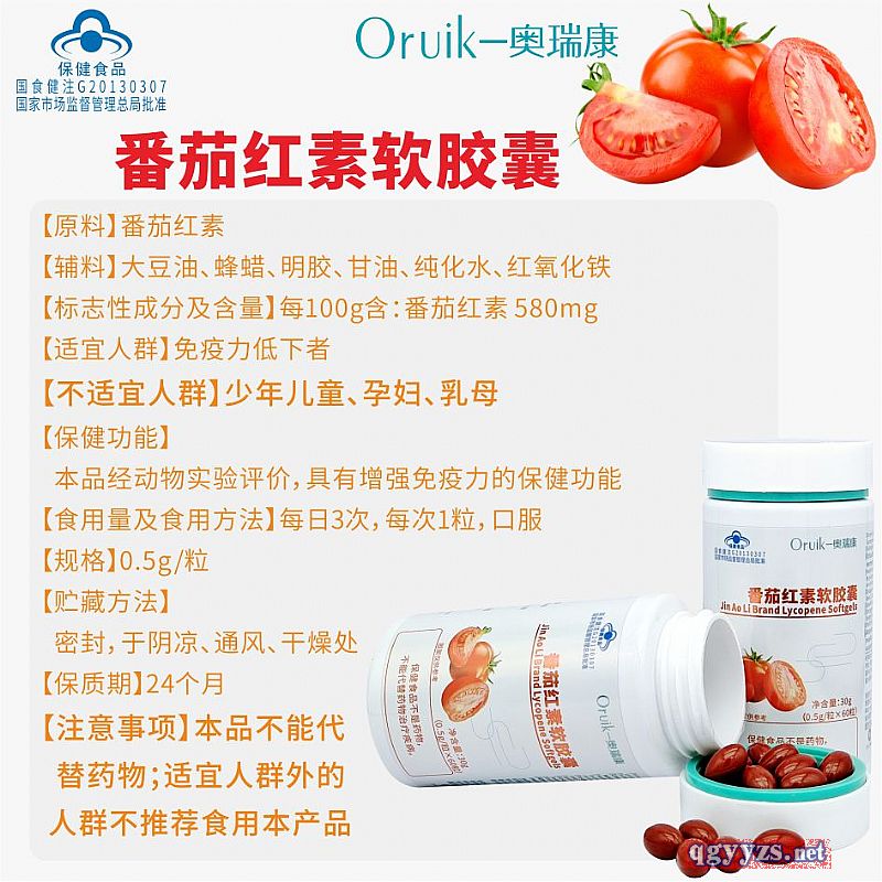 | 補充說明 | 【原料】番茄紅素 【輔料】大豆油、蜂蠟、明膠、甘油、純化水、紅氧化鐵 【標(biāo)志性成分及含量】每100g含:番茄紅素 580mg 【適宜人群】免疫力低下者 【不適宜人群】少年兒童、孕婦、乳母 【保健功能】本品經(jīng)動物實驗評價,具有增強免疫力的保健功能 【食用量及食用方法】每日3次,每次1粒,口服 【規(guī)格】0.5g/粒 【貯藏方法】密封,于陰涼、通風(fēng)、干燥處 【保質(zhì)期】24個月 【注意事項】本品不能代替藥物;適宜人群外的人群不推薦食用本產(chǎn)品 |