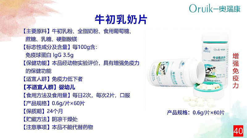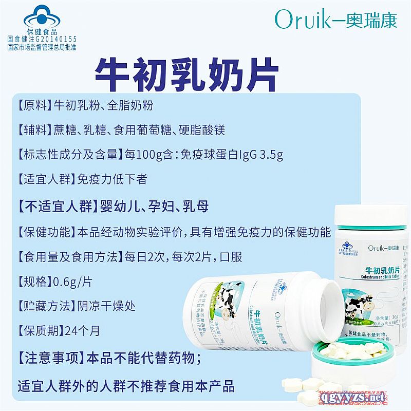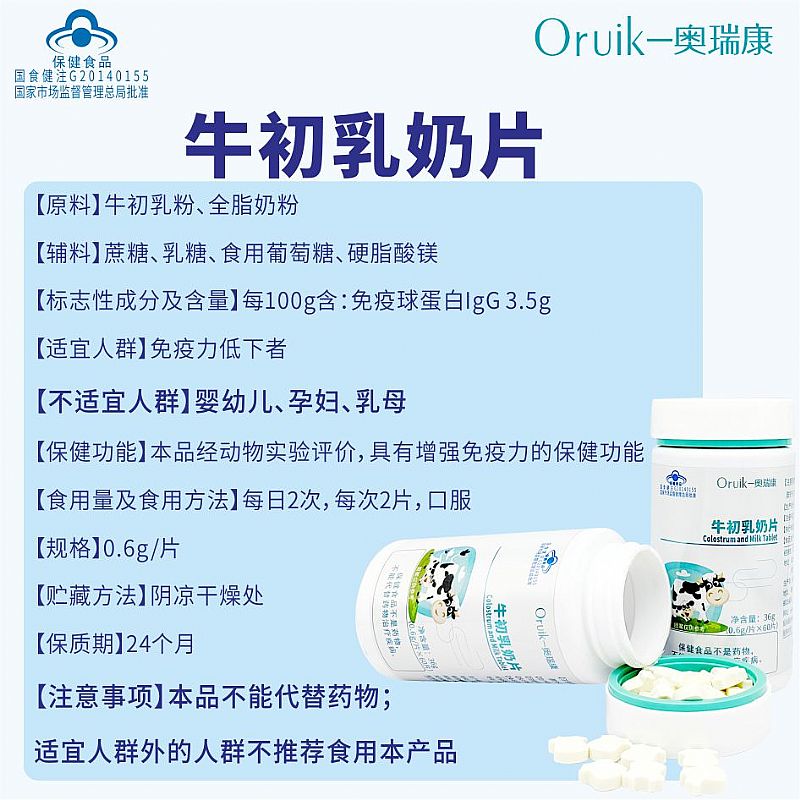 | 補(bǔ)充說明 | 【原料】牛初乳粉、全脂奶粉 【輔料】蔗糖、乳糖、食用葡萄糖、硬脂酸鎂 【標(biāo)志性成分及含量】每100g含:免疫球蛋白IgG 3.5g 【適宜人群】免疫力低下者 【不適宜人群】嬰幼兒、孕婦、乳母 【保健功能】本品經(jīng)動(dòng)物實(shí)驗(yàn)評價(jià),具有增強(qiáng)免疫力的保健功能 【食用量及食用方法】每日2次,每次2片,口服 【規(guī)格】0.6g/片 【貯藏方法】陰涼干燥處 【保質(zhì)期】24個(gè)月 【注意事項(xiàng)】本品不能代替藥物;適宜人群外的人群不推薦食用本產(chǎn)品 |