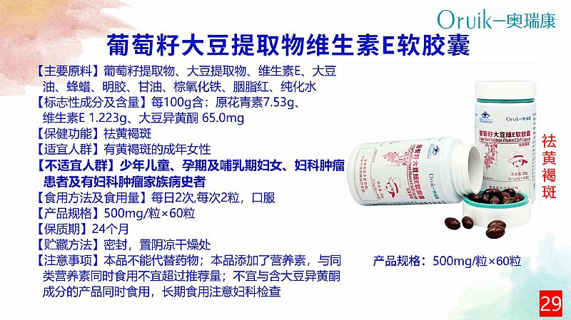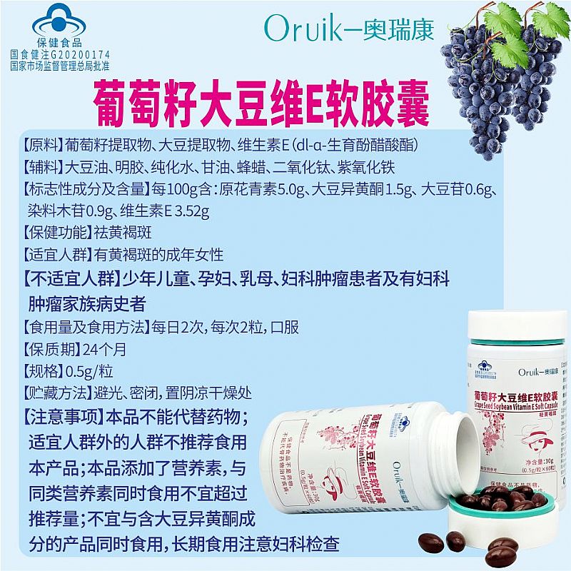 | 補充說明 | 【原料】葡萄籽提取物、大豆提取物、維生素E(dl-ɑ-生育酚醋酸酯) 【輔料】大豆油、明膠、純化水、甘油、蜂蠟、二氧化鈦、紫氧化鐵 【標志性成分及含量】每100g含:原花青素5.0g、大豆異黃酮 1.5g、大豆苷0.6g、染料木苷0.9g、維生素E 3.52g 【保健功能】祛黃褐斑 【適宜人群】有黃褐斑的成年女性 【不適宜人群】少年兒童、孕婦、乳母、婦科腫瘤患者及有婦科腫瘤家族病史者 【食用量及食用方法】每日2次,每次2粒,口服 【規(guī)格】0.5g/粒 |