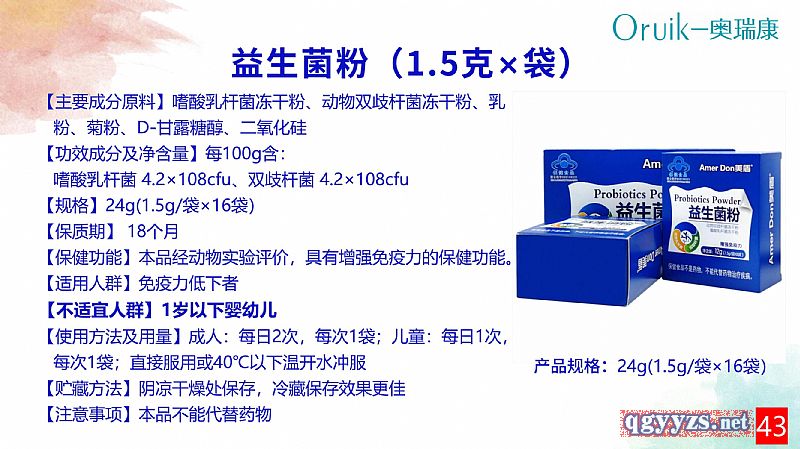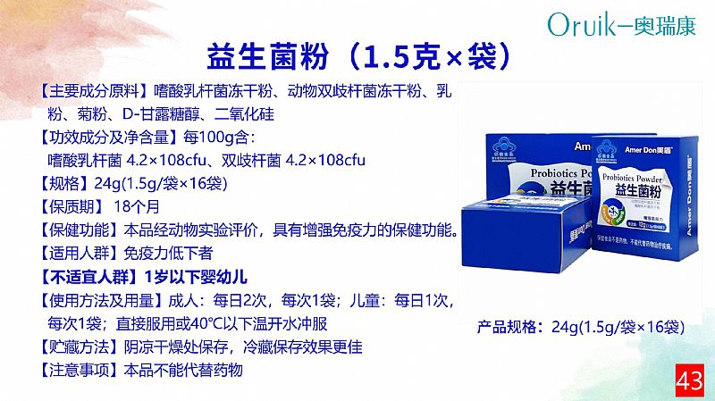 | 補(bǔ)充說明 | 本品是以嗜酸乳桿菌凍干粉、動(dòng)物雙歧桿菌凍干粉、乳粉、菊粉、D-甘露糖醇、二氧化硅為主要原料制成的保健食品,經(jīng)動(dòng)物功能試驗(yàn)證明,具有增強(qiáng)免疫力的保健功能。 【主要原料】嗜酸乳桿菌凍干粉、動(dòng)物雙歧桿菌凍干粉、乳粉、菊粉、D-甘露糖醇、二氧化硅 【標(biāo)志性成分及含量】每100g含:嗜酸乳桿菌4.2x108 cfu,雙歧桿菌4.2x108 cfu 【保健功能】本品經(jīng)動(dòng)物實(shí)驗(yàn)評(píng)價(jià),具有增強(qiáng)免疫力的保健功能。 【適宜人群】免疫力低下者 【不適宜人群】1歲以下嬰幼兒 【貯藏方法】陰涼干燥處保存,冷藏保存效果更佳 【注意事項(xiàng)】本品不能代替藥物 【食用方法及食用量】成人:每日2次,每次1袋;兒童:每日1次,每次1袋;直接服用或40℃以下溫開水沖服 【規(guī)格】1.5g/袋*16袋 |