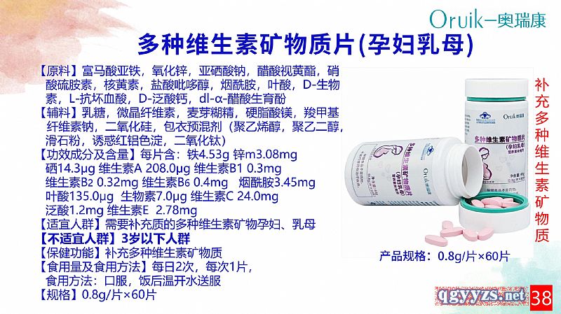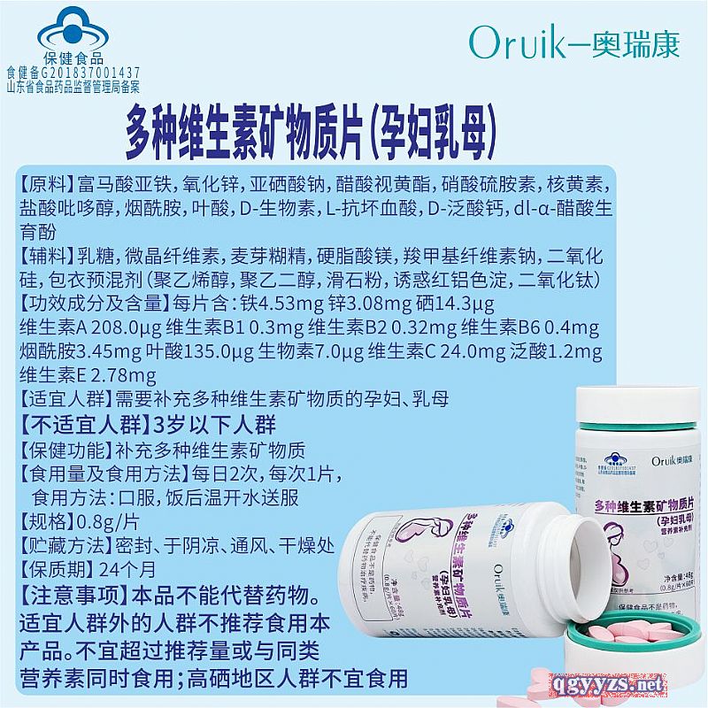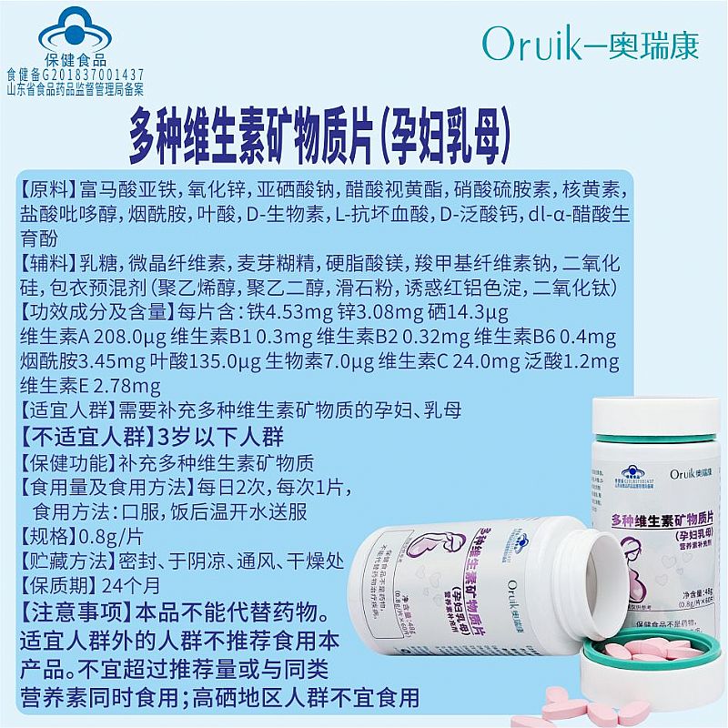 | 補充說明 | 【原料】富馬酸亞鐵,氧化鋅,亞硒酸鈉,醋酸視黃酯,硝酸硫胺素,核黃素,鹽酸吡哆醇,煙酰胺,葉酸,D-生物素,L-抗壞血酸,D-泛酸鈣,dl-α-醋酸生育酚 【輔料】乳糖,微晶纖維素,麥芽糊精,硬脂酸鎂,羧甲基纖維素鈉,二氧化硅,包衣預混劑(聚乙烯醇,聚乙二醇,滑石粉,誘惑紅鋁色淀,二氧化鈦) 【功效成分及含量】每片含:鐵4.53mg 鋅3.08mg 硒14.3μg 維生素A 208.0μg 維生素B1 0.3mg 維生素B2 0.32mg 維生素B6 0.4mg煙酰胺3.45mg 葉酸135.0μg 生物素7.0μg 維生素C 24.0mg 泛酸1.2mg 維生素E 2.78mg 【適宜人群】需要補充多種維生素礦物質的孕婦、乳母 【不適宜人群】3歲以下人群 【保健功能】補充多種維生素礦物質 【食用量及食用方法】每日2次,每次1片,食用方法:口服,飯后溫開水送服 【規(guī)格】0.8g/片 【貯藏方法】密封、于陰涼、通風、干燥處 【保質期】 24個月 【注意事項】本品不能代替藥物。適宜人群外的人群不推薦食用本產品。不宜超過推薦量或與同類營養(yǎng)素同時食用;高硒地區(qū)人群不宜食用 |