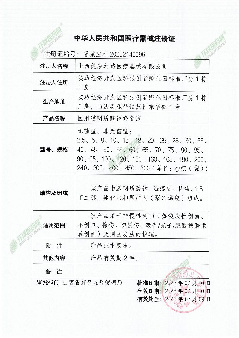 | 補(bǔ)充說(shuō)明 | 【產(chǎn)品名稱】醫(yī)用透明質(zhì)酸鈉修復(fù)液 【型號(hào)、規(guī)格】 型號(hào):無(wú)菌型、非無(wú)菌型; 規(guī)格:2.5g、5g、8g、10g、15g、18g、20g、25g、28g、30g、35g、40g、45g、50g、55g、60g、65g、70g、75g、80g、85g、90g、95g、100g、120g、150g、160g、165g、180g、200g、240g、300g、400g、450g、500g/瓶(袋)。 【結(jié)構(gòu)及組成】 該產(chǎn)品由透明質(zhì)酸鈉、海藻糖、甘油、1,3-丁二醇、純化水和聚酯瓶(聚乙烯袋)組成。 【產(chǎn)品性能】pH值范圍為5.0-7.5。 【適用范圍】該產(chǎn)品用于非慢性創(chuàng)面(如淺表性創(chuàng)面、小創(chuàng)口、擦傷、切割傷、激光/光子/果酸換膚術(shù)后創(chuàng)面)及周圍皮膚的護(hù)理。 【使用方法】外用。清潔患處皮膚,取本品外敷于患處。 【禁 忌 癥】 1、對(duì)外用透明質(zhì)酸鈉類制品,以及本品成分過(guò)敏者禁用。 2、痤瘡合并嚴(yán)重感染和膿皰者在炎癥未得到有效控制前不得使用。 3、本產(chǎn)品在醫(yī)生指導(dǎo)下應(yīng)用于開放性傷口及燒、燙傷,如出現(xiàn)不適,請(qǐng)立即停止使用或遵醫(yī)囑。 4、嬰幼兒、孕婦慎用。 【注意事項(xiàng)】 (1)本品較少出現(xiàn)過(guò)敏反應(yīng),一旦出現(xiàn)過(guò)敏反應(yīng),應(yīng)停用本品。 (2)本品僅供外用,不得內(nèi)服。 (3)本品經(jīng)滅菌處理,使用前確認(rèn)包裝是否完整,如遇破損,切勿使用。 (4)切勿直接接觸眼睛,如接觸眼睛,請(qǐng)用大量清水沖洗。 (5)本品性狀發(fā)生改變時(shí)禁止使用。 (6)使用前請(qǐng)閱讀說(shuō)明書,在產(chǎn)品有效期內(nèi)使用,超過(guò)有效期禁止使用。 (7)使用后的產(chǎn)品按照醫(yī)院規(guī)定或環(huán)保要求處理。 (8)開封后30天內(nèi)使用。 【儲(chǔ)存方法】應(yīng)貯存在陰涼干燥處,避免陽(yáng)光直射。 【運(yùn)輸】產(chǎn)品在運(yùn)輸過(guò)程中應(yīng)避免日曬、雨淋及重壓。 【配件清單】醫(yī)用透明質(zhì)酸鈉修復(fù)液、說(shuō)明書 【有效期】二年 【生產(chǎn)日期/生產(chǎn)批號(hào)/滅菌批號(hào)】見外包裝 【醫(yī)療器械生產(chǎn)許可證編號(hào)】晉藥監(jiān)械生產(chǎn)許20200012號(hào) 【醫(yī)療器械注冊(cè)證編號(hào)】晉械注準(zhǔn)20232140096 【醫(yī)療器械產(chǎn)品技術(shù)要求編號(hào)】晉械注準(zhǔn)20232140096 【注冊(cè)人名稱/生產(chǎn)企業(yè)】山西健康之路醫(yī)療器械有限公司 【注冊(cè)人住所/生產(chǎn)企業(yè)住所】侯馬經(jīng)濟(jì)開發(fā)區(qū)科技創(chuàng)新孵化園標(biāo)準(zhǔn)廠房1棟廠房 【生產(chǎn)地址】侯馬經(jīng)濟(jì)開發(fā)區(qū)科技創(chuàng)新孵化園標(biāo)準(zhǔn)廠房1棟廠房,曲沃縣樂昌鎮(zhèn)蘇村東華街1號(hào) |