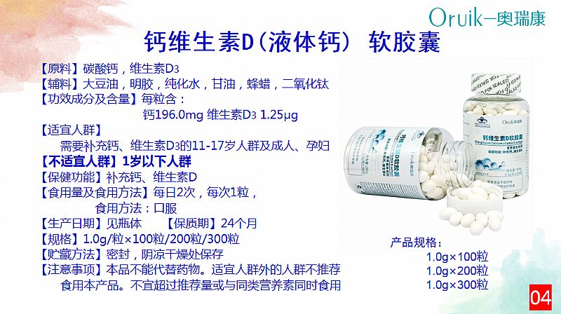 | 補充說明 | 原料】碳酸鈣,維生素D3 【輔料】大豆油,明膠,純化水,甘油,蜂蠟,二氧化鈦 【功效成分及含量】每粒含: 鈣196.0mg 維生素D3 1.25μg 【適宜人群】 需要補充鈣、維生素D3的11-17歲人群及成人、孕婦 【不適宜人群】1歲以下人群 【保健功能】補充鈣、維生素D 【食用量及食用方法】每日2次,每次1粒, 食用方法:口服 【生產(chǎn)日期】見瓶體 【保質(zhì)期】24個月 【規(guī)格】1.0g/!100粒/200粒/300粒 【貯藏方法】密封,陰涼干燥處保存 【注意事項】本品不能代替藥物。適宜人群外的人群不推薦 食用本產(chǎn)品。不宜超過推薦量或與同類營養(yǎng)素同時食用 |