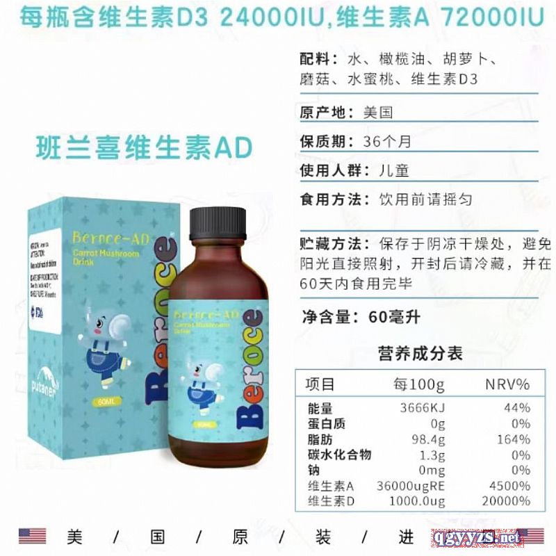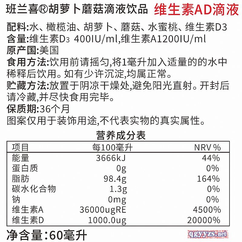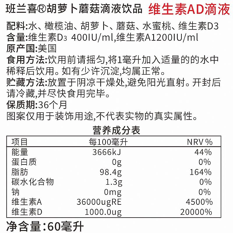 | 補(bǔ)充說(shuō)明 | 配料:水、 橄欖油、 胡蘿卜、 蘑菇、 水蜜桃、 維生素D3 含量:維生素D3 400IU/ml,維生素A1200IU/ml 原產(chǎn)國(guó):美國(guó) 食用方法:飲用前請(qǐng)搖勻,將1毫升加入適量的的水中 稀釋后飲用。 如有少許沉淀,均屬正常。 貯藏方法:放置于陰涼干燥處,避免陽(yáng)光直射。 開(kāi)封后請(qǐng)冷藏,并盡快食用完畢。 保質(zhì)期:36個(gè)月 |