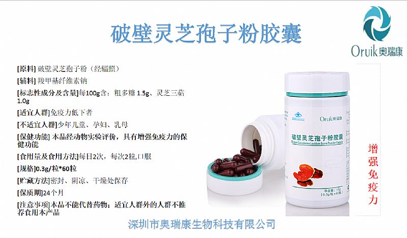 | 補充說明 | [原料] 破壁靈芝孢子粉(經(jīng)輻照) [輔料] 羧甲基纖維素鈉 [標志性成分及含量]每100g含: 粗多糖 1.5g、靈芝三萜 1.0g [適宜人群]免疫力低下者 [不適宜人群]少年兒童、孕婦、乳母 [保健功能] 本品經(jīng)動物實驗評價,具有增強免疫力的保健 功能 [食用量及食用方法]每日2次,每次2粒,口服 [規(guī)格]0.3g/!60粒 [貯藏方法]密封、陰涼、干燥處保存 [保質(zhì)期]24個月 [注意事項]本品不能代替藥物;適宜人群外的人群不推薦食 用本產(chǎn)品 |
