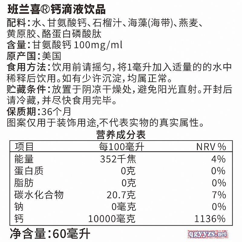 | 補充說明 | 鈣滴液飲品 配料:水、甘氨酸鈣、石榴汁、海藻(海帶)、燕麥、黃原膠、酪蛋白磷酸肽 含量:甘氨酸鈣100mg/ml 原產(chǎn)國:美國 食用方法:飲用前請搖勻,將1毫升加入適量的的水中稀釋后飲用或加入其他食品中食用 。如有少許沉淀,均屬正常。 貯藏條件:放置于陰涼干燥處,避免陽光直射。開封后請冷藏,并盡快食用完畢。 保質(zhì)期:36個月 |