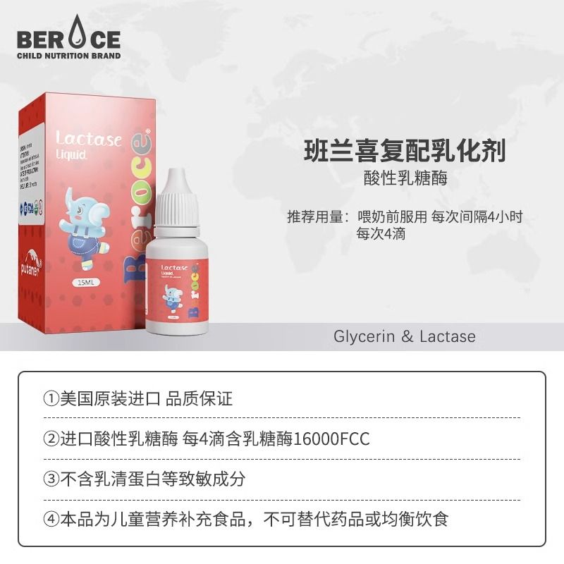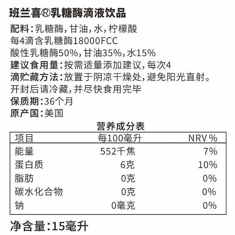 | 補充說明 | 乳糖酶 配料:乳糖酶,甘油,水,檸檬酸 每4滴含乳糖酶18000FCC,酸性乳糖酶50%,甘油35%,水15% 建議食用量:按需適量添加建議,每次4滴 貯藏方法:放置于陰涼干燥處,避免陽光直射。 開封后請冷藏,并盡快食用完畢 保質(zhì)期:36個月 原產(chǎn)國:美國 |